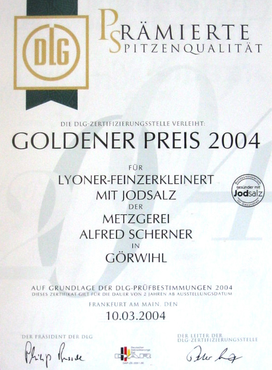 Im März 2006 erhielten wir einen Goldenen Preis. Unser Chilipeitsche mit Jodsalz wurde von der DLG damit ausgezeichnet. Wir glauben darauf können wir schon ein wenig stolz sein. |